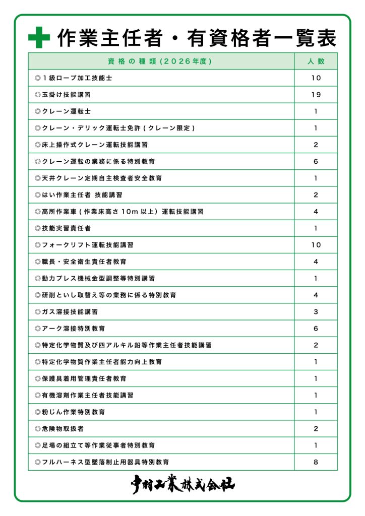 中村工業では、安全で確実な加工・施工を行うため、資格取得を会社として積極的に推進しています。