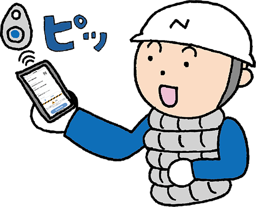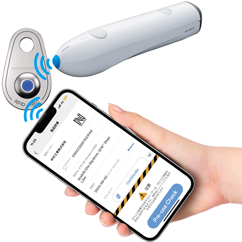 RFIDタグを取り付けた製品を非接触スキャン。ミスなく識別可能。使用前点検をデジタル化。 (次回の点検日も担当者に通知)